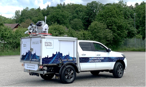 Pour ce faire, un véhicule de mesure parcourt les rues situées dans le périmètre du renouvellement. Le véhicule est équipé d’un système de mesure moderne (voir photo ci-dessous) qui enregistre l’environnement. Ce système se compose de plusieurs caméras et de deux scanners laser qui enregistrent très rapidement et précisément des points de mesure.