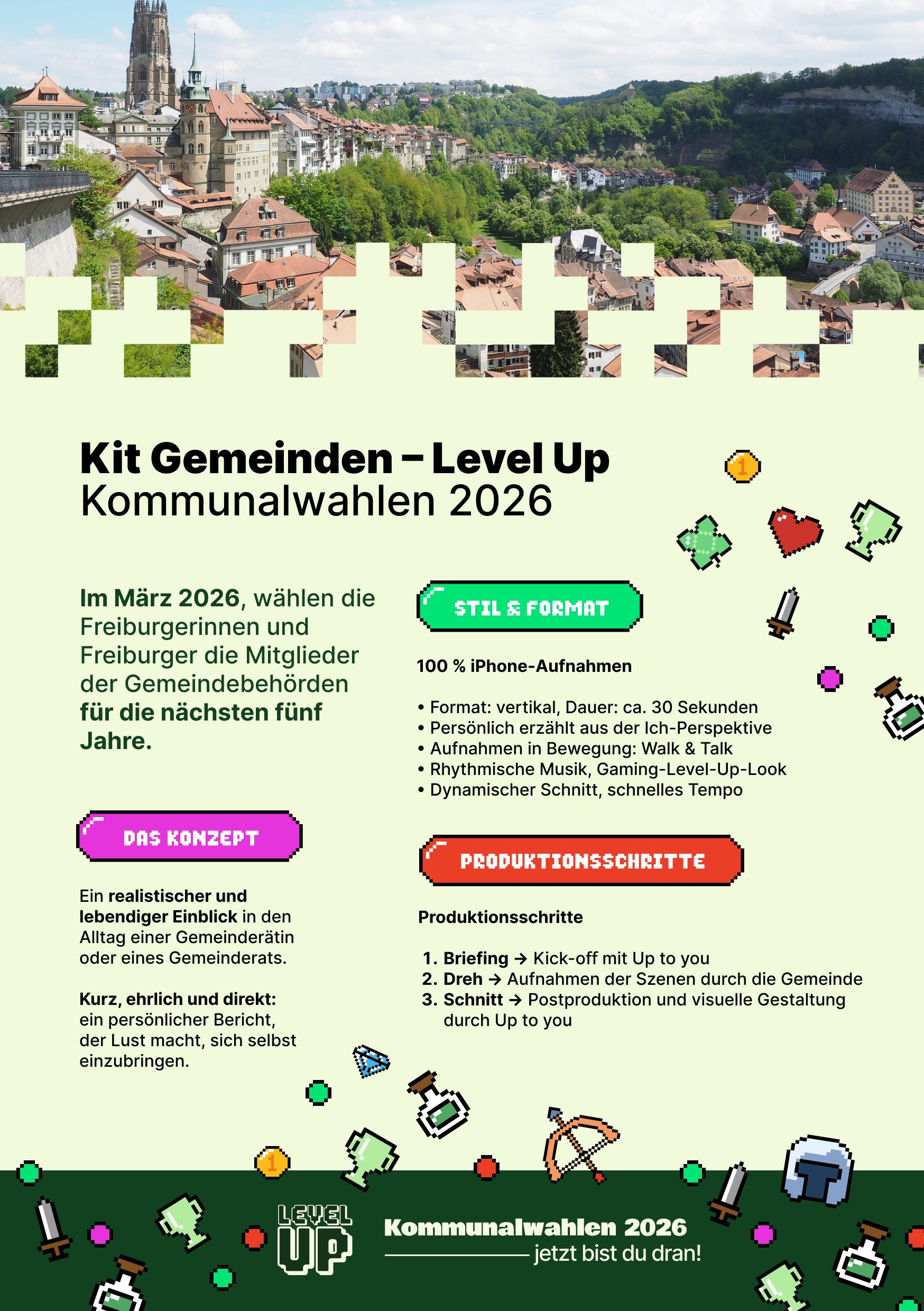Die Direktion der Institutionen und der Land- und Forstwirtschaft lanciert in Zusammenarbeit mit dem Freiburger Gemeindeverband (FGV) die Kampagne «Level Up – Gemeindewahlen 26», um das Engagement für die eigene Gemeinde zu fördern.
